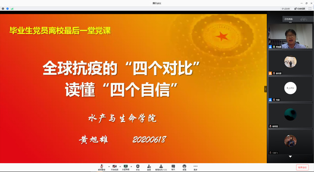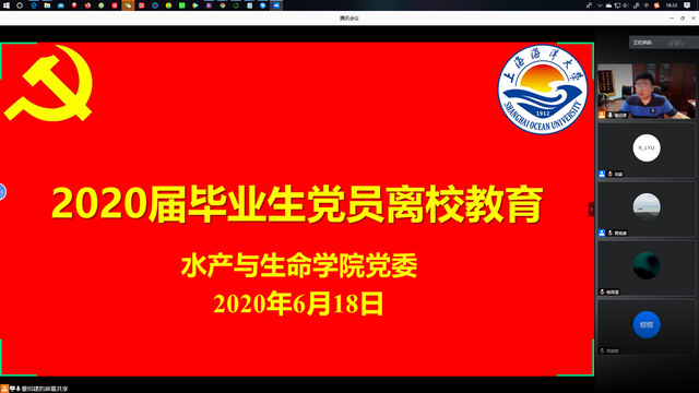 6月18日晚上,水产与生命学院在腾讯会议平台组织开展了2020届毕业生党员离校教育活动。学院党委书记黄旭雄,校党委组织部马红丽,学院全体毕业生党员、各支部书记、支委、发展对象和入党积极分子代表参加。会议由学院专职组织员董绍建主持。