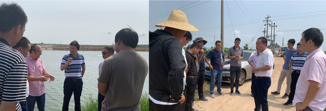 随后,服务团在光明渔业有限公司梁海涛总经理等人的陪同下,对公司的鳗鲡、加州鲈、河蟹、南美白对虾和草鱼等养殖基地进行调研,详细询问了基地相关情况,并探讨了高温条件下的养殖技术要点,针对不同养殖对象和模式,现场提出了提质增效的可行性建议。