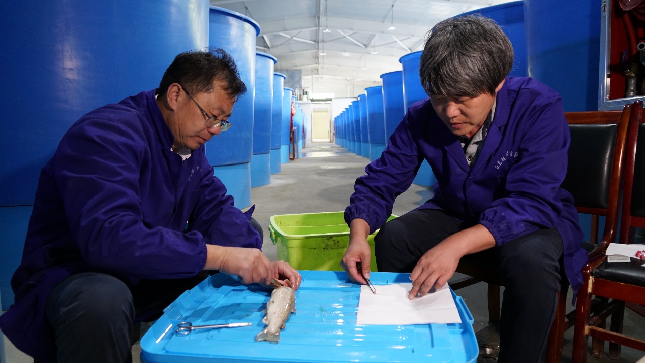 王成辉、陆颖教授在工厂化养殖车间进行病鱼解剖、采样