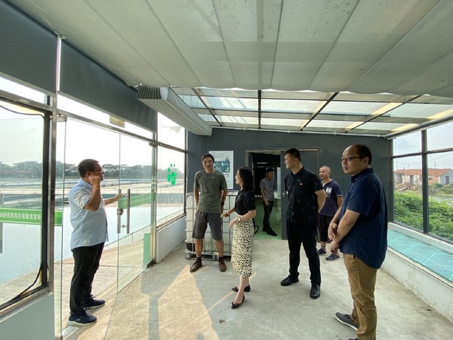 随后,教授博士团来到常州金蟹水产有限公司进行技术指导。首先了解了该公司河蟹养殖和销售情况,该公司目前具有200亩的成蟹养殖池塘,以精品蟹养殖为主,从2017年开始进行电商销售,目前发展势头良好。公司负责人金丽娜女士大学毕业后毅然投身农业,是一个具有开拓精神的“新农人”和“蟹二代”。教授博士团对该基地成蟹养殖过程中的“雨后水浑”、“高温期伊乐草漂浮”和“雌雄河蟹成熟时间不同步影响上市时间”等问题进行了解答,建议该基地“采用复合型水草种植技术和池塘土工布护坡防止水混和伊乐草漂浮等”,“通过投喂高脂肪饲料可以使得河蟹提早成熟,从而实现提前上市”,建议2021年该公司可以采用“河蟹公母分养技术”来提高养殖成活率和经济效益。
