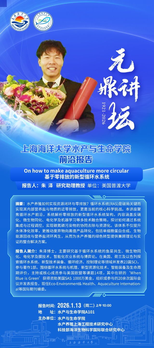学术讲座通知——朱泽:基于零排放的新型循环水系统(水产养殖上海工程技术研究中心、科技部海洋生物科学国际联合研究中心学术报告)