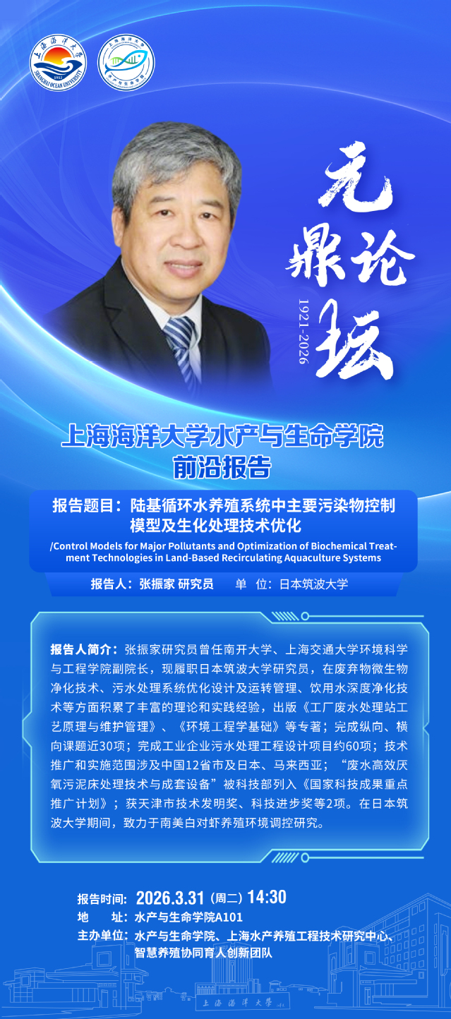 | 学术讲座通知——张振家:陆基循环水养殖系统中主要污染物控制模型及生化处理技术优化(上海水产养殖工程技术研究中心、智慧养殖协同育人创新团队学术报告) |