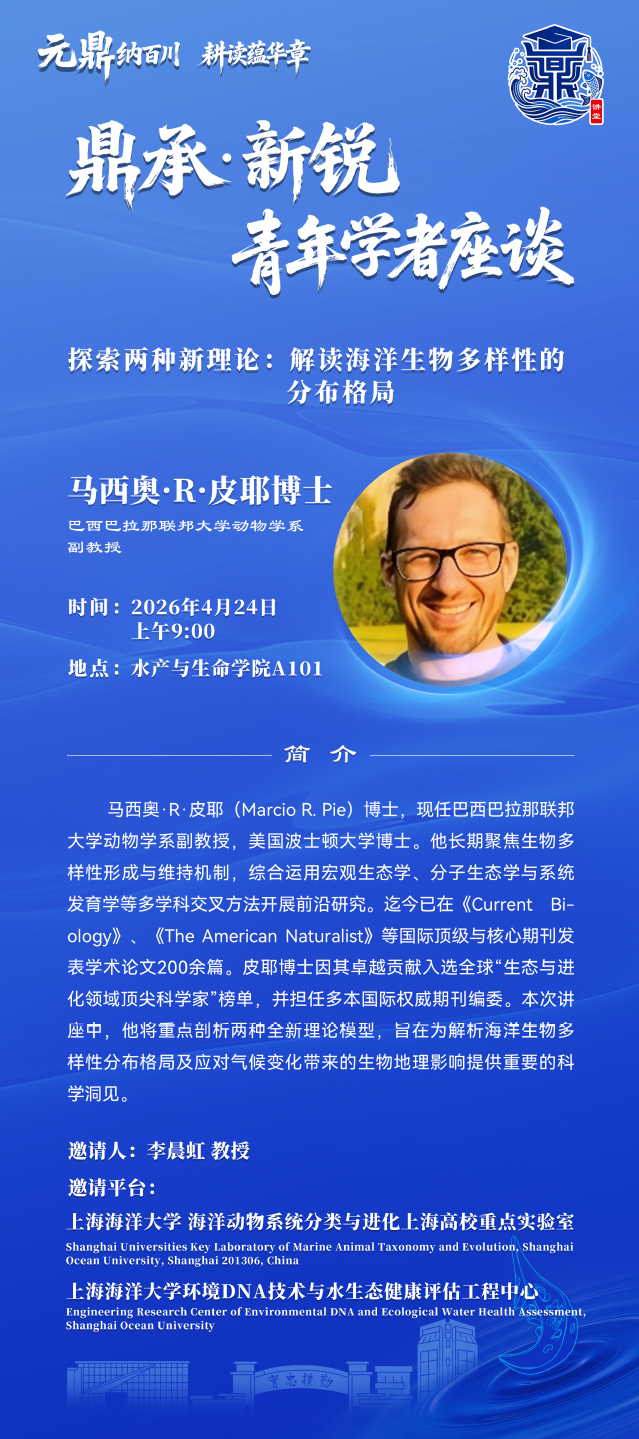 | 学术讲座通知——马西奥·R·皮耶:探索两种新理论:解读海洋生物多样性的分布格局(上海海洋大学环境DNA技术与水生态健康评估工程中心学术报告) |