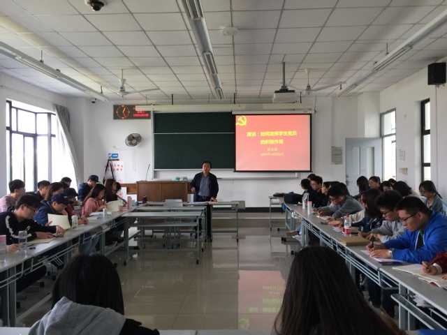 2018年10月23日下午,水产与生命学院党委书记张宗恩为预备党员培训班的学员上党课,党课以座谈会的形式开展,主题为:如何发挥学生党员的积极作用。本次党课旨在提高我院预备党员的党性修养,让同学们明确自己的党员身份,在生活、学习中发挥先锋模范带头作用,提升为人民服务的本领。
