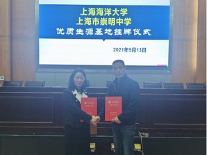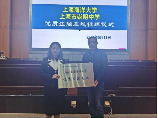 会后陈立婧同崇明中学副校长王思毅签署了《上海海洋大学优秀生源基地合作意向书》,“优秀生源基地”正式在崇明中学挂牌。