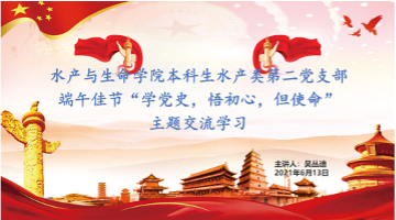 为不断推进党史学习教育,水产与生命学院水产类第二党支部于2021年6月13日在线上开展迎端午“学党史,悟初心,担使命”主题交流活动。活动由党支部书记吴丛迪主持,全体支部党员参与。