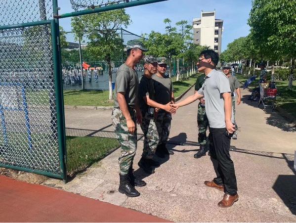 物资发放完毕后,张宇峰书记与教官、参训师生亲切交谈,感谢教官为军训工作付出的努力,希望全体参训师生认真学习教官的优良作风,发扬不怕苦不怕累的精神,为同学们加油打气。