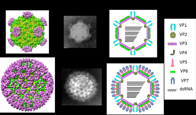 草鱼和青鱼是我国四大家鱼之二,是重要的经济养殖鱼类。草鱼出血病从上世纪70年在我国淡水养殖基地大面积发生,其后由我国学者鉴定其病原为呼肠孤病毒科一新成员,即草鱼呼肠孤病毒(GCRV)。由GCRV感染引起的草鱼出血病,可导致草鱼及一些鲤科鱼类鱼种出现严重的出血症状并导致大规模死亡。GCRV感染不仅对我国水产养殖业造成了巨大损失,而且对淡水鱼类养殖产业的健康发展也造成严重威胁。通过对GCRV873毒株长期系统深入研究,已从基因与蛋白水平解析GCRV基因组11条dsRNA片段(S1-S11)编码7种结构蛋白和至少6种非结构蛋白。此外,根据对目前所分离的GCRV毒株序列分析及依据S6基因预测的编码蛋白同源性比较结果,将GCRV分为GCRV-I(代表毒株GCRV873)、GCRV-II(代表毒株GCRVHZ08)和GCRV-III(代表毒株GCRV104)三种类型。流行病学显示,GCRV-II是目前我国流行的毒株类型。虽然不同类型GCRV感染宿主后的发病症状基本相似,但基于S7基因编码蛋白特性不同(如在细胞培养物上的病理变化及病毒结构特征等),提示GCRV-II基因进化为宿主共存的趋势更为明显,这一特征与MRV遗传进化更为相似。对GCRV不同分离株的一系列研究结果,为进一步揭示GCRV-I与GCRV-II/III及MRV的进化关系,以及病毒在侵染复制过程中与宿主相互作用机制奠定了坚实的基础。