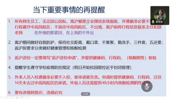 学院党委书记黄旭雄传达了近期学校疫情防控工作会议精神,详细解读了《关于进一步严格校园疫情防控管理的工作提示29》等文件。他指出,针对当前的疫情形势,学校会议对疫情防控工作提出了新的要求和任务,全院教职员工一是要提高政治站位,强化大局意识,充分发挥学院疫情防控工作领导小组和各党支部战斗堡垒作用,全体教职工要绷紧疫情防控的弦,坚决克服麻痹松懈思想;二是要将责任落实到位,抓实抓细各项工作,各基组要压实责任,划出违规处理的红线,恪守底线,各级基层组织要及时掌握师生的思想动态和健康状况,做好“十类”返沪返校师生员工分类管理,及时报备,积极回应;三是要坚定必胜信心,全院上下要群策群力,众志成城,按照上级要求做好校园疫情防控管理工作的同时,积极提前谋划学院各项应急处置预案,配合学校谋划新学期开学方案等,共同为学校疫情防控工作继续作出积极贡献,确保师生平安、校园平安。