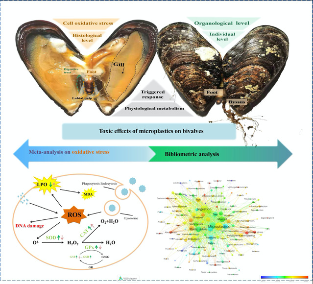 该研究以Meta分析和文献计量学分析为主要手段,进行了微塑料对双壳类的毒性效应的系统分析和评估,并探究了微塑料的颗粒性质对于其毒性效应的影响。该研究表明,微塑料可以诱导双壳类动物产生时间依赖性的氧化应激反应。微塑料短期暴露后,抗氧化酶如谷胱甘肽过氧化物酶(GPx)、谷胱甘肽转移酶(GST)和超氧化物歧化酶(SOD)的活性被激活。随着暴露时间的增加,微塑料对抗氧化系统的毒性作用将逐渐增强,长期暴露后这些酶的活性将被抑制。GPx、GST和SOD对微塑料暴露的非线性响应表明,这些酶并非是评估微塑料对双壳类动物的毒性效应的良好生物标志物。相反,组织谷胱甘肽(GSH)水平和过氧化氢酶(CAT)活性在短期和长期的微塑料暴露中均有升高。文献计量分析结果表明,近年来关于微塑料对双壳类动物的毒理学效应的研究主要集中在海洋环境中的微塑料污染和微塑料的分子毒性机制。此外,微塑料对双壳类的毒性作用还表现为对其摄食、消化和繁殖等与健康相关的生理性状产生负面影响。