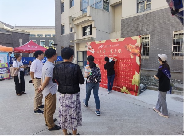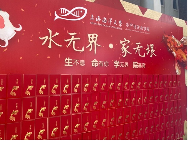 本次迎新的主题为“生命学院,命中有你”。9月21日晚,院学生会在团委副书记吴丛迪老师的带领下,连夜于第一小区和第九小区的迎新站点处搭建了锦鲤背景墙,挂满锦鲤福袋。锦鲤流传千古均象征着吉祥平安,见之乃祥瑞之兆,也被水产养殖界称为“水中的活宝石”,锦鲤背景墙表达了水产与生命学院寄予新生的美好祝福与期望。福袋内容为学院专属徽章、戒指徽章套盒等礼品,新生纷纷对学院的精心准备表示惊喜与感动。